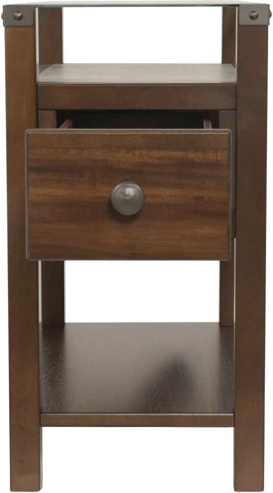Lightening up with a “floating” glass tabletop that adds so much modern flair, this chairside end table merges a highly contemporary aesthetic with rustic warmth. Antique bronze-tone brackets add a touch of industrial cool. AC power and USB slots on the side make this simply chic chairside end table plenty practical.Read More