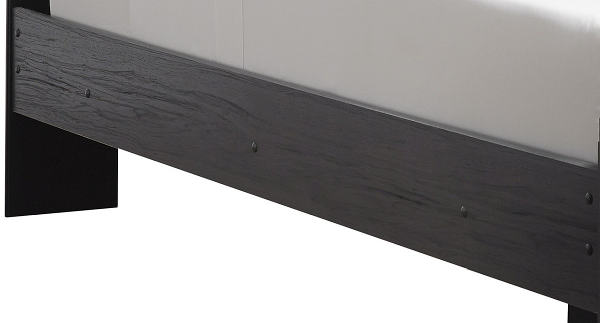 Modern gray finish with replicated wood grain. Cases and bed are accented with faceted chrome details. Large scaled chrome handle with faceted details.