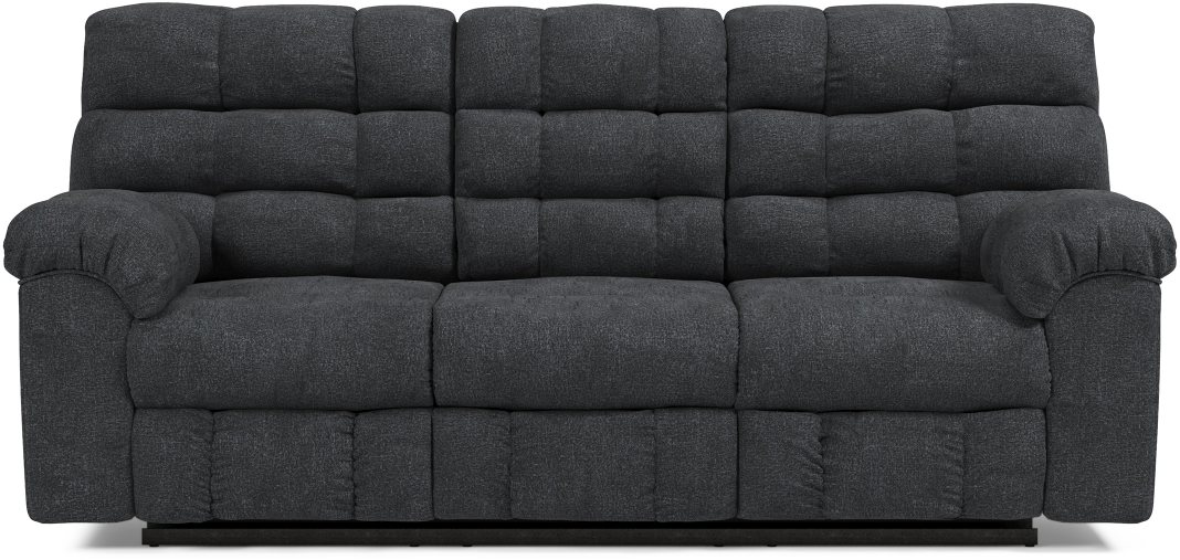 Embrace ultimate comfort and style with this reclining sofa with drop-down table with cup holders for added functionality. Covered in a feel-good blue-gray fabric beautified with puckered stitching and biscuit-back tufting, this quality reclining sofa entices with generously stuffed armrests that make it that much more of a dream scene.Read More