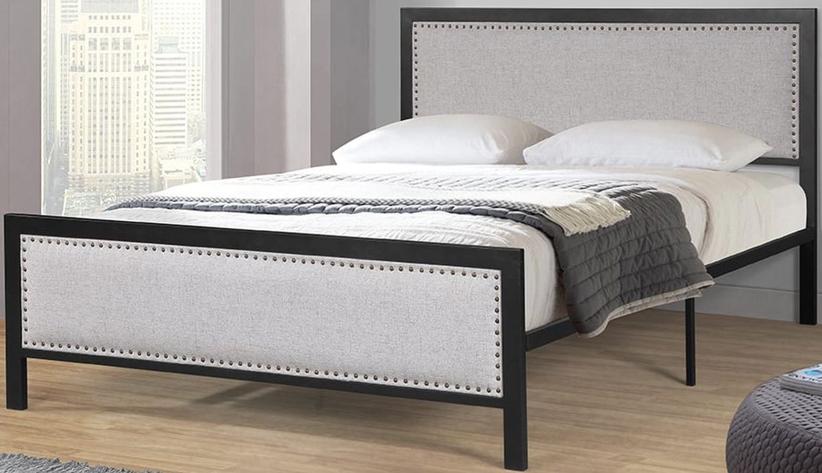 The bold, contemporary design of this bed will help create a sleeping area sure to impress. With sharp lines, metal frame and nailheads on grey linen-style fabric.Read More