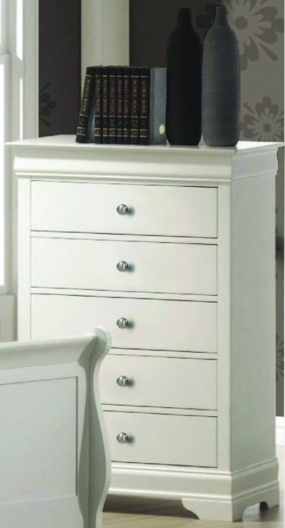 A beautiful addition to your bedroom, this Louis Phillipe chest with clean white finish includes impressive edged molding and brass finish pulls. Includes 5 large drawers, providing ample storage.Read More