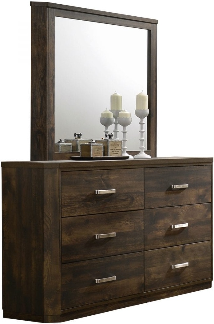 This beautiful walnut finish dresser with matching mirror and contemporary hardware and lines will be sure to impress, while offering plenty of storage opportunities. Includes 5 storage drawers. Unique, beveled corners and chrome pulls.Read More